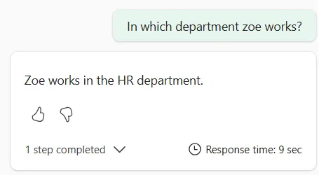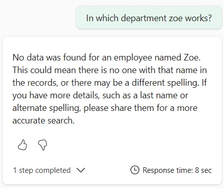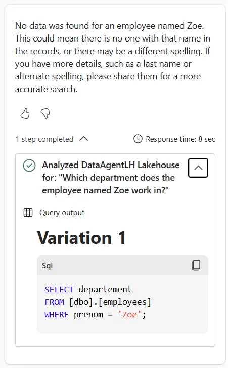 So, with this data loaded in a Lakehouse table, and after configuring our Data agent, letâs try to find ZoĂ©.